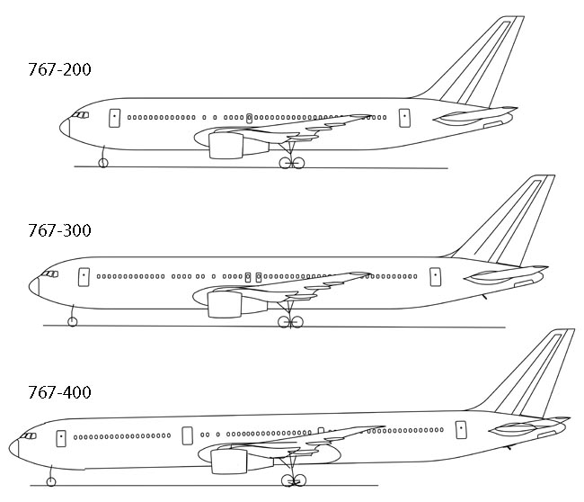 767-300ER Odvozená verze od B767-300 s větším doletem a vyšší vzletovou hmotností. Ve střední části křídla má zamontovánu přídavnou nádrž, která zvyšuje celkovou kapacitu na 91 029 litrů paliva. V srpnu 1987 objednaly British Airways B767-300ER s motory Rolls-Royce RB211-524H a poprvé tak byly na B767 namontovány motory Rolls-Royce. Do dubna 2011 bylo vyrobeno 548 letadel 767-300ER a výroba stále pokračuje.