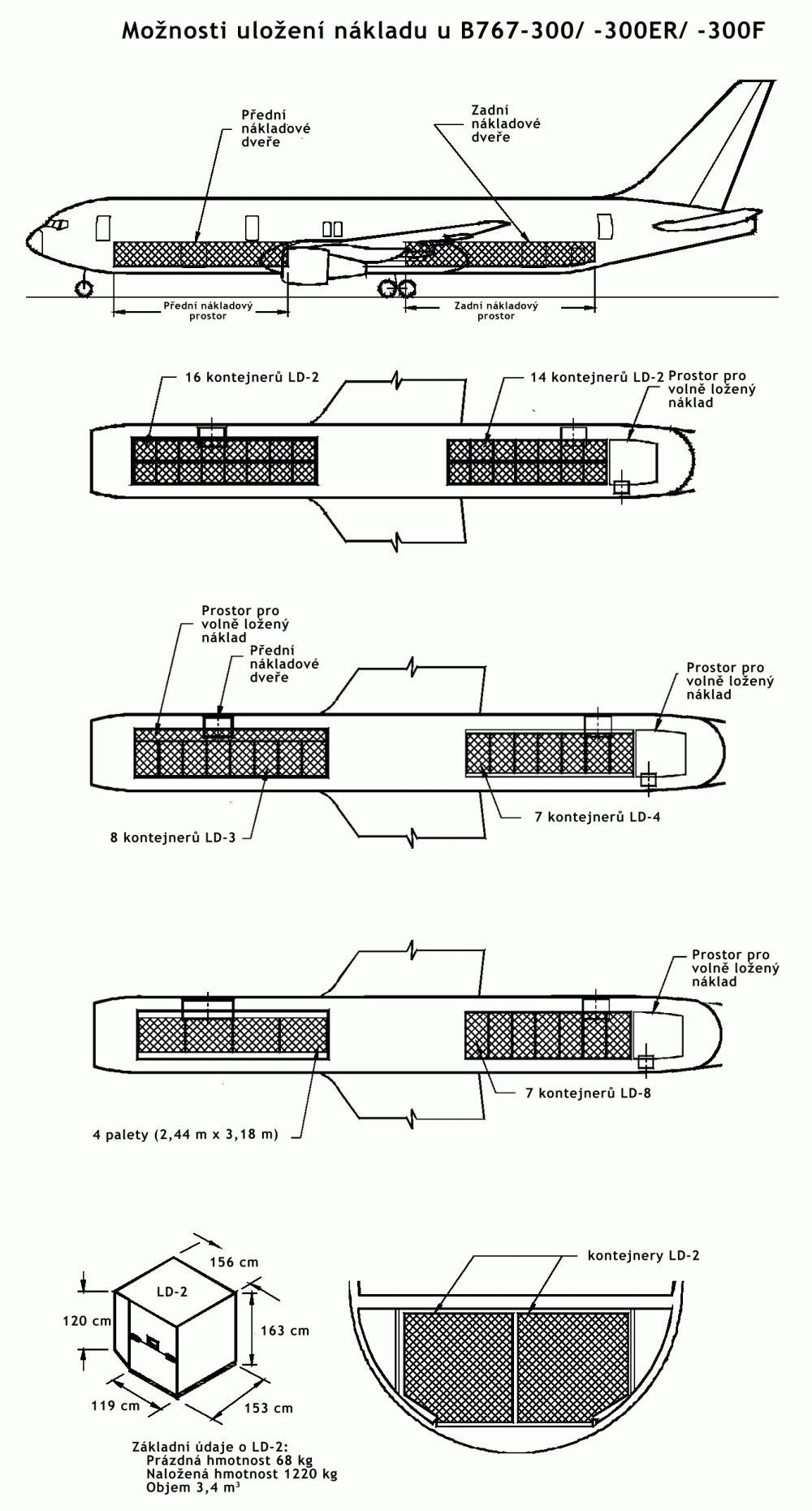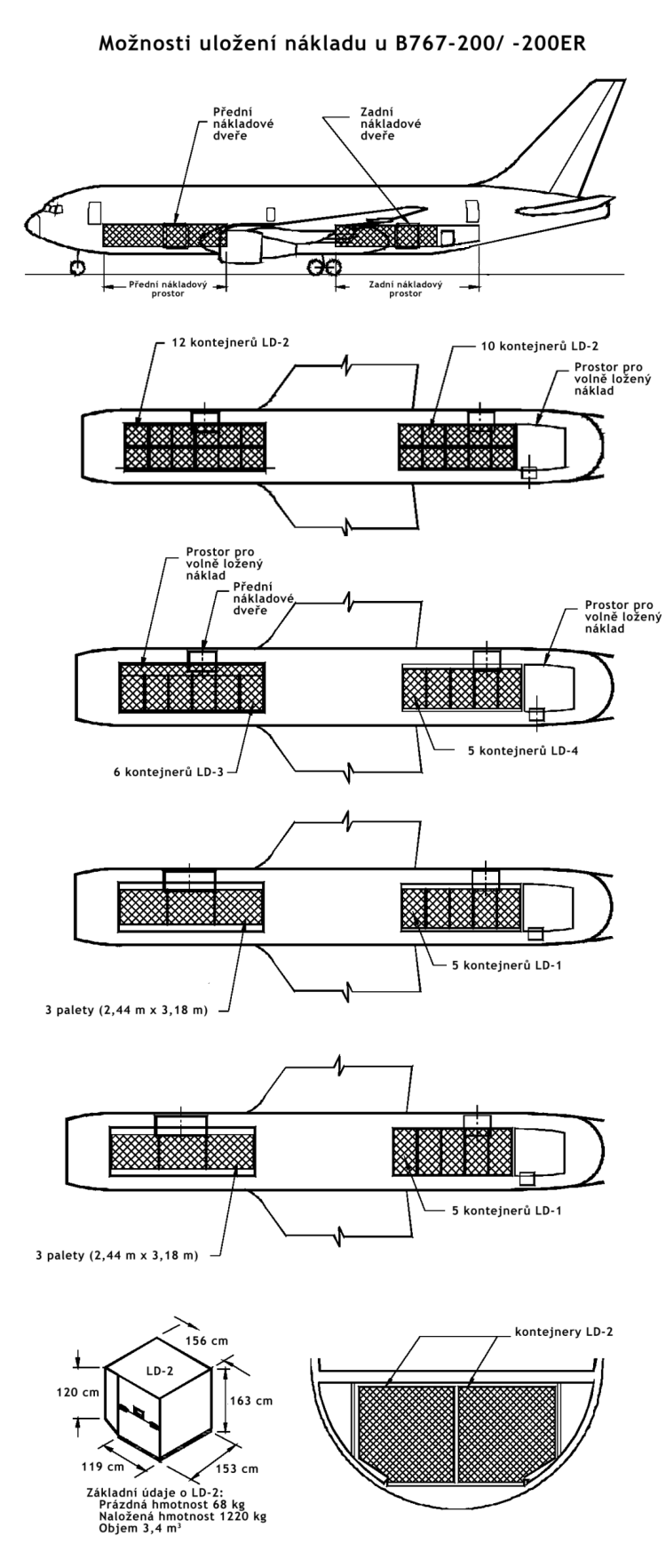 767-300F Od modelu -300ER je odvozena i nákladní varianta Boeingu 767. Vývoj této verze byl zahájen v roce 1993 v reakci na objednávku od United Parcel Service z 15. ledna 1993. UPS měla zájem až o 60 kusů nákladní verze B767-300 s motory GE CF6-80C2 (následně bylo dodáno pouze 30 strojů). B767-300F pojme až 336,6 m3 nákladu na hlavní palubě a dalších 101,6 m3 pod ní. Na hlavní palubu je možno umístit až 24 kontejnerů či palet o půdorysu 235,5 cm x 317,5 cm, na spodní palubu až 30 kontejnerů LD-2 nebo 15 LD-1 a doplňkový náklad ložený mimo kontejnery. Další možnosti kombinace různých kontejnerů a palet jsou na obrázku v galerii. Nahoru otevíratelná nákladová vrata (rozměry 2,67 × 3,40 m) jsou umístěna v levé přední části trupu. Na spodní palubu vedou troje menší dveře. Hned za kokpitem jsou také na levé straně jedny dveře pro osádku, které vedou do vestibulu s toaletou, umývárnou a prostoru pro doprovod. Z trupu jsou odstraněna veškerá okna i vnitřní vybavení. Zesílen byl podvozek, konstrukce křídla, podlahy a centroplánu. Vnitřní nákladové prostory mohou být přetlakovány, s možností regulace teploty, což umožňuje přepravu zvířat či kazícího se zboží. Hlavní i spodní paluba jsou vybaveny automatickým systémem pro manipulaci s nákladem. Interiér hlavní paluby trupu má hladké laminátové obložení, od pilotní kabiny je oddělen bezpečnostní přepážkou.
